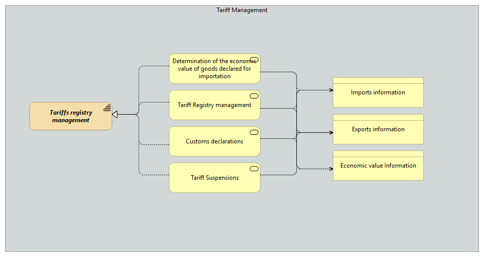 The view also includes several Business Service ABBs, which represent digital public services related to tariff management. These services include "Tariff Suspensions", "Customs declarations", "Tariff Registry management", and "Determination of the economic value of goods declared for importation". Each of these services plays a unique role in the tariff management process, from suspending tariffs and managing the tariff registry to declaring customs and determining the economic value of imported goods.
