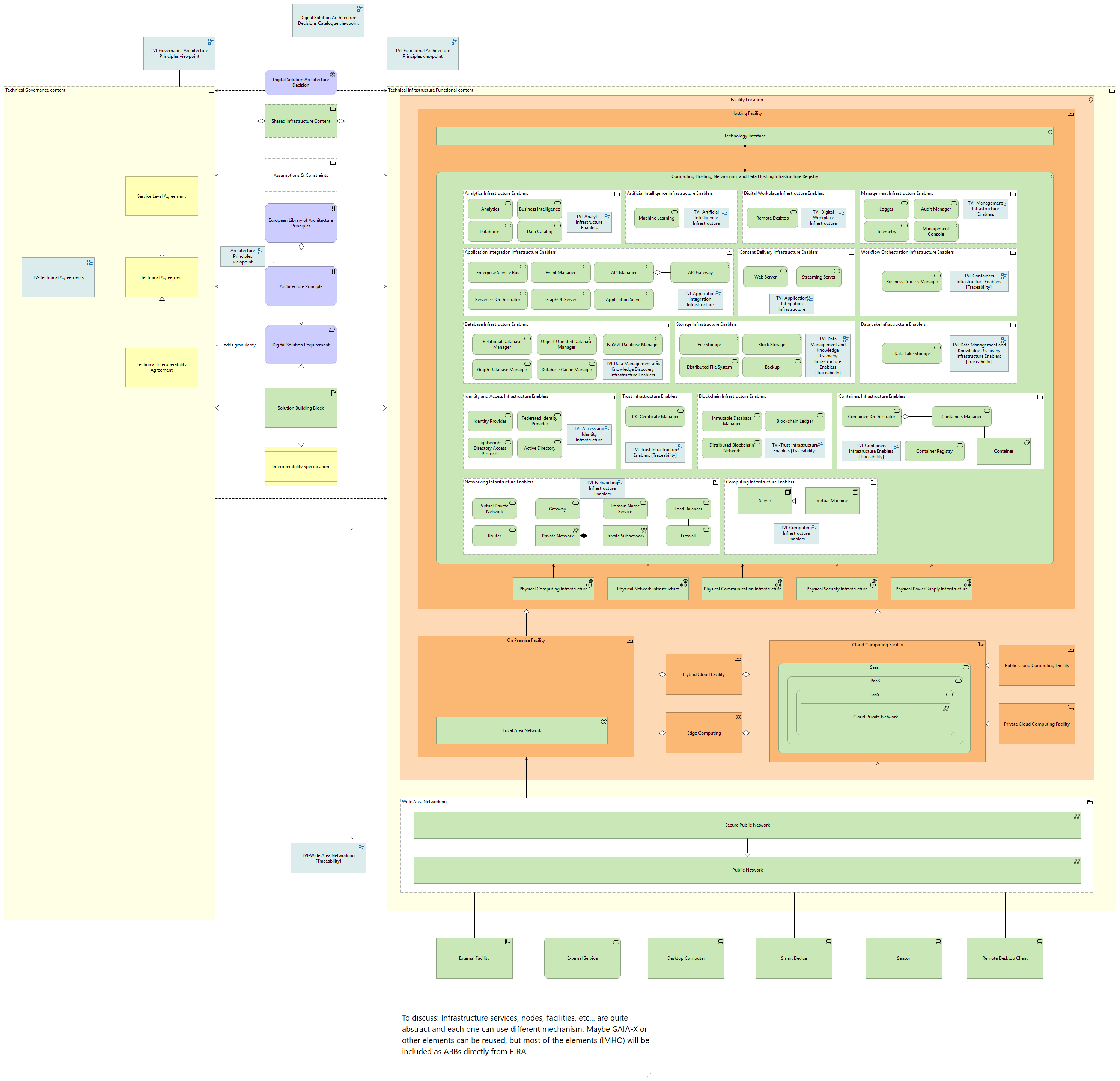 In the same way, as it happens in the Technical Application view, the [Technical Governance Content], the [Technical Agreement], and its specialisations [Tech Interoperability Agreement] and [Service Level Agreement] constitute the [Technical Governance Content] and influence the whole [Technical Infrastructure Functional Content]. Both, [Technical Governance Content] and [Technical Infrastructure Functional Content] are aggregated by the [Shared Infrastructure Content]. The infrastructure is located in a [Facility Location] and hosted using a [Hosting Facility]. [Hosting Facility] is realised by [Computing Hosting, Networking and Data Hosting Infrastructure]. The capabilities of a [Hosting Facility] are supported by a set of physical (in place) elements: [Physical Computing Infrastructure], [Physical Network Infrastructure], [Physical Communication Infrastructure], [Physical Power Supply Infrastructure] and [Physical Security Infrastructure]. [Analytics Infrastructure Enablers] aggregates [Analytics Technology Service], [Business Intelligence Technology Service], [Databricks Technology Service], and [Data Catalog Technology Service]. The [Artificial Intelligence infrastructure Enablers] aggregates [Machine Learning Technology Service]. [Digital Workplace Infrastructure Enablers] aggregates [Remote Desktop Technology Service]. [Management Infrastructure Enablers] includes four elements aggregated [Logger Technology Service], [Audit Manager Technology Service], [Telemetry Technology Service] and [Management Console Technology Service]. [Application Integration Infrastructure Enablers] aggregates a set of technology services to facilitate integration in organisations and are [Enterprise Service Bus Technology Service], [Event Manager Technology Service], [API Manager Technology Service], which is aggregated by an [API Gateway Technology Service], also [Serverless Orchestrator Technology Service], [GraphQL Server Technology Service] and [Application Service]. [Content Delivery Infrastructure Enablers] aggregates [Web Server Technology Service] and [Streaming Server Technology Service]. [Process Orchestration Infrastructure Enablers] aggregates [Business Process Manager Technology Service]. The [Database Infrastructure Enablers] aggregates [Relational Database Manager Technology Service], [Object-Oriented Database Manager Technology Service], [NoSQL Database Manager Technology Service], [Graph Database Manager Technology Service], and [Database Cache Manager Technology Service]. [Storage Infrastructure Enablers] aggregates [File Storage Technology Service], [Block Storage Technology Service], [Backup Technology Service], and [Distributed File System Technology Service]. [Data Lake Infrastructure Enablers] aggregates [Data Lake Storage Technology Service]. The [Identity and Access Infrastructure Enablers] aggregates [Identity Provider Technology Service], [Federated Identity Provider Technology Service], and [Lightweight Directory Access Technology Service]. [Trust Infrastructure Enablers] aggregates [PKI Certificate Manager Technology Service]. [Blockchain Infrastructure Enablers] aggregates [Inmutable Database Manager Technology Service], [Blockchain Ledger Technology Service], and [Distributed Blockchain Network Technology Service]. [Containers Infrastructure Enablers] aggregates [Container Orchestrator Technology Service] is aggregated by [Containers Manager Technology Service], which is associated to [Container Registry Technology Service], and [Container]. [Networking Infrastructure Enablers] aggregates [Virtual Private Network Technology Service], [Gateway Technology Service], [Domain Name Service Technology Service], and a [Router Technology Service] associated to a [Private Network], composed by a [Private Subnetwork], associated to [Firewall], which is associated to [Load Balancer Technology Service]. [Computing Infrastructure Enablers] is composed with [Virtual Machine] node. [Virtual Machine] specialise a [Server] node. [On Premise Facility] and [Cloud Computing Facility] specialise [Computing Hosting, Networking and Data Hosting Infrastructure]. [On Premise Facility] includes [Local Area Network]. [Cloud Computing Facility] is associated with [SaaS], which is composed of [PaaS], and [PaaS] is composed of [IaaS]. The [IaaS] includes [Cloud Private Network]. [Hybrid Cloud Facility] and [Edge Computing] aggregate both [On Premise Facility], and [Cloud Computing Facility]. Also, [On Premise Facility] and [Cloud Computing Facility] are served by [Wide Area Networking], which aggregates [Secure Public Network], specialised by [Public Network]. [Additional Area Networking] includes several associations that can be established with external services, facilities or devices, for instance [External Facility], [External Service], [Desktop Computer], [Smart Device], [Sensor], [Remote Desktop Client].